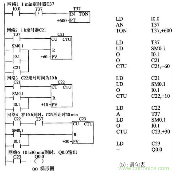 2.延時停止控製 定時時間到,延時停止。I0.0為啟動按鈕、I0.1為停止按鈕。