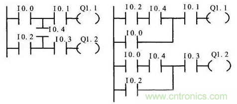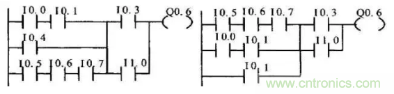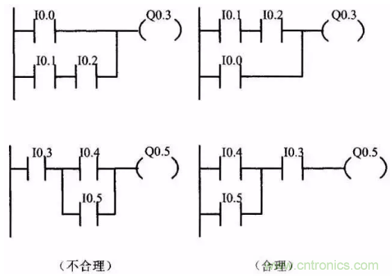 (3)幾個串聯支路相並聯,應將觸點多的支路安排在上麵;幾個並聯回路的串聯,應將並聯支路數多的安排在左麵。按此規則編製的梯形圖可減少用戶程序步數,縮短程序掃描時間。