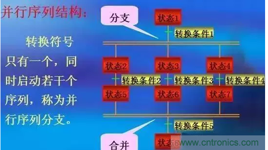 選擇序列的開始稱為分支,轉換符號隻能標在水平線之下,每個分支上必須具有一個或一個以上的轉換條件,且具有優先級。