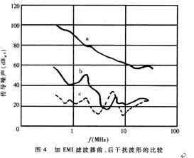 EMI濾波器能有效抑製單片開關電源的電磁幹擾。圖4中曲線a為不加EMI濾波器時開關電源上0.15MHz~30MHz傳導噪聲的波形(即電磁幹擾峰值包絡線)。曲線b是插入如圖3(d)所示EMI濾波器後的波形,能將電磁幹擾衰減50dBμV~70dBμV。顯然,這種EMI濾波器的效果更佳。