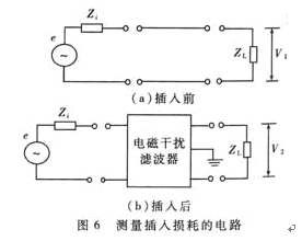 e是噪聲信號發生器,Zi是信號源的內部阻抗,ZL是負載阻抗,一般取50Ω。噪聲頻率範圍可選10kHz~30MHz。首先要在不同頻率下分別測出插入前後負載上的噪聲壓降V1、V2,再代入(2)式中計算出每個頻率點的AdB值,最後繪出插入損耗曲線。需要指出,上述測試方法比較煩瑣,每次都要拆裝EMI濾波器。為此可用電子開關對兩種測試電路進行快速切換。