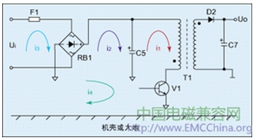 圖1中,當電源開關管V1導通或者關斷時,在電容器C5、變壓器T1的初級和電源開關管V1組成的電路中會產生脈動直流i1,如果把此電流回路看成是一個變壓器的“初級線圈”,由於電流i1的變化速率很高,它在“初級線圈”中產生的電磁感應,也會對周圍電路產生電磁感應,我們可以把周圍電路都看成是同一變壓器的多個“次級線圈”,同時變壓器T1的漏感也同樣對各個“次級線圈”產生感應作用,因此電流i1通過電磁感應,在每個“次級線圈”中都會產生的感應電流,我們分別把它們記為i2、i3、i4 •••。