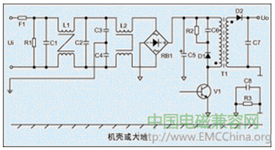 圖1是一個普遍應用的反激式(或稱為回掃式)開關電源工作原理圖,50Hz或60Hz交流電網電壓首先經整流堆整流,並向儲能濾波電容器C5充電,然後向變壓器T1與開關管V1組成的負載回路供電。圖2是進行過電磁兼容設計後的電氣原理圖。