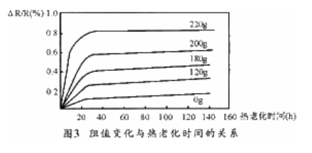 圖3所示為卡瑪線在不同拉力下繞製後,在190℃溫度熱老化過程中阻值隨時間的變化曲線。拉力越大,阻值在熱老化時的變化也越大,這說明熱處理是消除應力影響的有效措施。