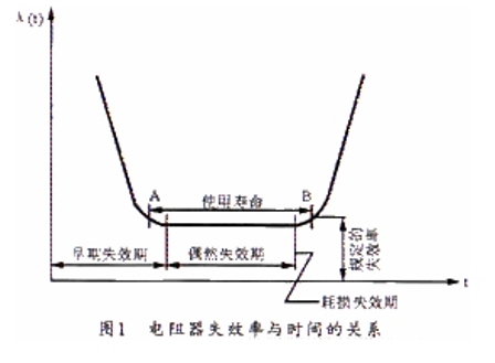 電阻器產品在正常條件下使用的失效可分為三種類型,即早期失效、偶然失效和耗損失效。圖1所(suo)示(shi)是(shi)電(dian)阻(zu)器(qi)失(shi)效(xiao)率(lv)與(yu)時(shi)間(jian)的(de)關(guan)係(xi)曲(qu)線(xian)。從(cong)曲(qu)線(xian)上(shang)可(ke)看(kan)出(chu)三(san)種(zhong)失(shi)效(xiao)的(de)三(san)個(ge)階(jie)段(duan)。由(you)於(yu)偶(ou)然(ran)失(shi)效(xiao)出(chu)現(xian)在(zai)產(chan)品(pin)可(ke)靠(kao)工(gong)作(zuo)的(de)時(shi)期(qi),研(yan)究(jiu)這(zhe)一(yi)時(shi)期(qi)的(de)失(shi)效(xiao)因(yin)素(su)有(you)重(zhong)要(yao)意(yi)義(yi)。要(yao)提(ti)高(gao)產(chan)品(pin)的(de)可(ke)靠(kao)性(xing),必(bi)須(xu)加(jia)強(qiang)產(chan)品(pin)對(dui)各(ge)種(zhong)"應力"所能耐受的強度。這裏所謂的"應力"是指對產品功能有影響的各種因素,如溫度、電壓電流、機械力等。