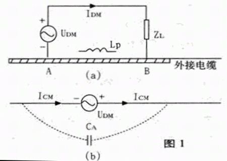 圖1是電流驅動模式的示意圖。圖1(a)中UDM是差模電壓源,設備內部有很多這樣的源,例如各種數字信號電路、高頻振蕩源等等,ZL為回路負載,IDM為回路負載的差模電流,該電流流過AB兩點間的回流地(例如印製板的地線),回到差模源。如AB間存在一定的電感LP,則產生壓降為