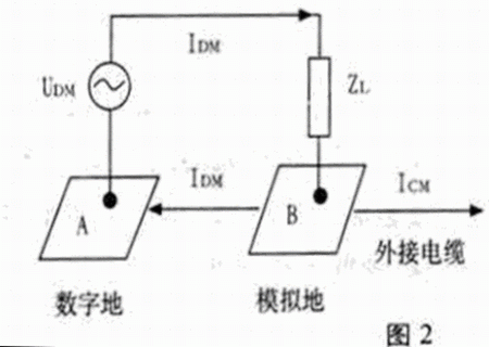 例1:在印製電路板上為了把數字部分和模擬部分隔離,常把地分割成數字地和模擬地。如果這兩部分之間有信號聯係,如圖2所示,並且數字地和模擬地的連接部分AB比較細長,存在一定電感,則差模電流IDM將在AB連接線的電感上產生共模驅動電壓源,從而引起共模輻射,天線一部分是數字地,另一部分是模擬地和外接地線。