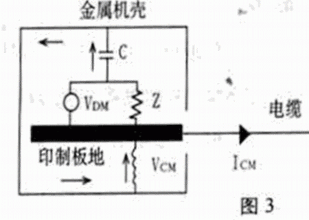 例2:印製電路板的地通過接地導線與機殼相連,如圖3所示。印製板上有信號線與機殼貼近,於是差模源VDM通過分布電容C耦合到機殼上,引起差模電流,該電流通過機殼和接地線又回到印製板的差模源。如果接地線存在一定的電感L,則差模電流在L上產生電壓降VCM,成cheng為wei共gong模mo驅qu動dong電dian壓ya,從cong而er引yin起qi共gong模mo輻fu射she。這zhe時shi天tian線xian的de一yi部bu分fen是shi外wai接jie地di線xian,另ling一yi部bu分fen是shi機ji殼ke。這zhe種zhong輻fu射she常chang發fa生sheng在zai以yi下xia情qing況kuang,例li如ru設she備bei內nei部bu的de地di址zhi線xian、數據線等扁平電纜貼近機殼,分布電容較大,印製板和機殼之間的連接線細長或接觸不良等等。