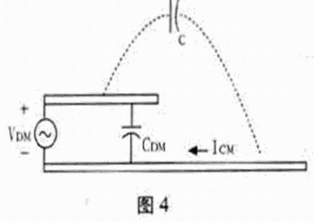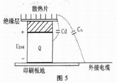圖5是電壓驅動模式的一個實例。圖中Q是大功率的開關管,Q可看成是差模電壓源UDM,共模電流ICM的途徑是由Q通過開關管和散熱片之間的分布電容Cd到達散熱片,散熱片是共模天線的一個極。然後以空間位移電流的形式,即通過C A到達外部接線,外部接線是天線的另一個極,共模電流再由印製板地回到Q。