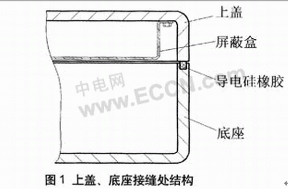 上蓋、底座接縫處的結構采用圖1所示形式,這樣不僅可以提高屏蔽效能,還可以提供可靠的環境密封。同時為了避免上蓋、底座兩部分的相互幹擾,設計時用一屏蔽盒將整個上蓋裏的電路模塊、元器件、部件等罩住,這樣使維修更方便。