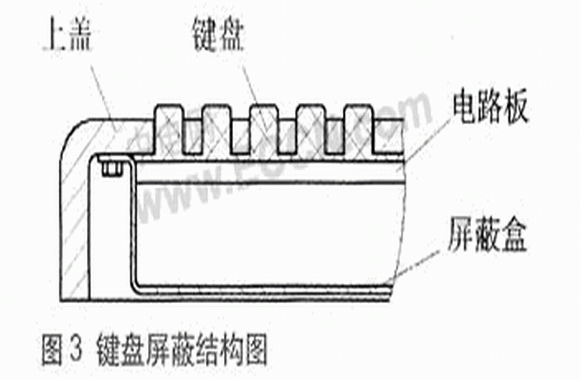 本ben終zhong端duan鍵jian盤pan采cai用yong矽gui橡xiang膠jiao專zhuan用yong鍵jian盤pan,安an裝zhuang在zai上shang蓋gai表biao麵mian,開kai口kou較jiao多duo,易yi引yin起qi電dian磁ci泄xie漏lou,降jiang低di屏ping蔽bi效xiao能neng。因yin為wei孔kong縫feng對dui電dian磁ci波bo的de衰shuai減jian與yu幹gan擾rao波bo波bo長chang及ji孔kong縫feng尺chi寸cun有you關guan,一yi般ban應ying使shi孔kong洞dong的de尺chi寸cun遠yuan小xiao於yu電dian磁ci波bo的de波bo長chang,隻zhi要yao孔kong縫feng的de直zhi徑jing足zu夠gou小xiao,就jiu能neng夠gou達da到dao所suo要yao求qiu的de屏ping蔽bi效xiao能neng。但dan一yi般ban按an鍵jian的de大da小xiao、排列應符合人們的操作習慣,按鍵太小使用不方便,故這裏主要采取安裝屏蔽罩的方法來減少電磁泄漏。鍵盤的屏蔽結構設計如圖3所示。