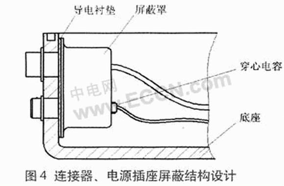 由於連接器與終端的接觸阻抗比較大,使得屏蔽電纜的共模傳導發射變大,為了防止由此引起的輻射超標,在連接器(插座)與底座以及屏蔽罩之間安裝導電襯墊,這種襯墊材料經模切壓成,墊在連接器(插座)與屏蔽罩之間,具有良好的電接觸性能,能有效地控製該處縫隙泄漏。連接器、電源插座屏蔽結構設計如圖4所示。