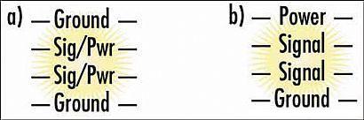 [page]第一種為首選方案,PCB的外層均為地層,中間兩層均為信號/電源層。信號層上的電源用寬線走線,這可使電源電流的路徑阻抗低,且信號微帶路徑的阻抗也低。從EMI控製的角度看,這是現有的最佳4層PCB結構。