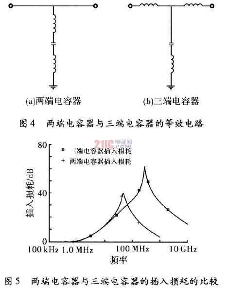 取差模電容Cx為0.1μF,共模電容Cy為2200pF,共模電感L取8mH。三端電容的等效串聯電感ESL取0.36nH。在50 Ω/50 ΩQ係統中分別對一般結構的EMI濾波器和使用了三端電容器的EMI濾波器的插入損耗進行PSpice仿真。如圖7所示,EMI濾波器在使用三端電容時,諧振點之後的插損效果明顯好於在濾波器中使用兩端電容的插損。提高了濾波器在高頻段的性能。