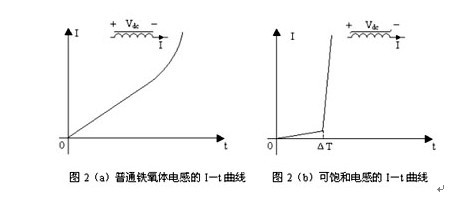 普通鐵氧體電感和可飽和電感在直流電壓Vdc作用下的電流強度I隨時間t變化的曲線如圖2(a)和圖2(b)所示。