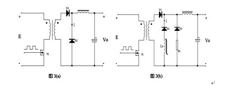 在圖3(a)所示的正激電源電路中,當初級功率管V1開始導通,次級整流二極管D1開始導通,D2開始截止時,由於二極管PN結的電荷存儲效應,D2中流過了電流變化率di/dt很大的反向恢複尖峰電流i,致使V1、D1中也有相應的尖峰電流流過,在漏感、線電感等因素的共同作用下會在電源輸出端產生高頻的導通噪聲。在D2上施加的反向電壓越大,D2的反向恢複時間越長,反向恢複電流變化率di/dt就越大,電源輸出噪聲也就越大。大的反向恢複尖峰電流,不僅會產生電源噪聲,也容易損壞整流器件。[page]