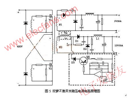 磁(ci)放(fang)大(da)器(qi)穩(wen)壓(ya)是(shi)利(li)用(yong)可(ke)飽(bao)和(he)電(dian)感(gan)導(dao)通(tong)延(yan)時(shi)的(de)物(wu)理(li)特(te)性(xing)來(lai)控(kong)製(zhi)開(kai)關(guan)電(dian)源(yuan)的(de)占(zhan)空(kong)比(bi)和(he)輸(shu)出(chu)功(gong)率(lv),穩(wen)定(ding)電(dian)源(yuan)輸(shu)出(chu)電(dian)壓(ya)的(de)一(yi)種(zhong)方(fang)法(fa)。在(zai)可(ke)飽(bao)和(he)電(dian)感(gan)上(shang)加(jia)上(shang)適(shi)當(dang)的(de)采(cai)樣(yang)和(he)控(kong)製(zhi)元(yuan)件(jian),調(tiao)節(jie)其(qi)導(dao)通(tong)延(yan)時(shi)的(de)時(shi)間(jian),就(jiu)可(ke)以(yi)構(gou)成(cheng)最(zui)常(chang)見(jian)的(de)磁(ci)放(fang)大(da)器(qi)穩(wen)壓(ya)電(dian)路(lu)。圖(tu)5是一個輸入為110Vac~220Vac/50HZ,輸出為5Vdc/20A,12Vdc/10A的雙管正激開關穩壓電源,其中5V是主控回路。其輔路12Vshuchudianliujiaoda,duiwenyajingduhefuzaiwendingdudouyoujiaogaoyaoqiu,caiyongputongdefangfawenyaxiaoguodoubushihenlixiang,ruguocaiyongcifangdaqiwenyajishujiukeyuanmanjiejuezheyiwenti,shiwenyadianludejiegoujiandan,haosangonglvxiao,bingkedadaohaofujidewenyajingdu。