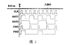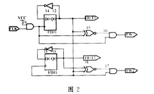 分頻電路可根據各具體幹擾源的脈衝寬度來確定。具體電路如圖2所示,CLK為8M晶振信號,經整形後作為DQ觸發器的觸發信號,OUT1輸出二分頻後的4M方波信號,同時作為下一級觸發器的時鍾信號OUT2輸出四分頻後的2M方波信號,FW1輸出頻率為4M、脈寬為125ns的脈衝信號,FW2輸出頻率為2M、脈寬為250ns的脈衝信號,具體波形如圖3所示。由此類推,繼續級連DQ觸發器即可輸出八分頻、十六分頻信號,脈寬也可視具體情況而作相應的改變,電路類似FW1、FW2的產生電路。