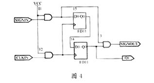 根(gen)據(ju)幹(gan)擾(rao)源(yuan)的(de)情(qing)況(kuang),以(yi)前(qian)麵(mian)所(suo)述(shu)信(xin)號(hao)作(zuo)為(wei)觸(chu)發(fa)時(shi)鍾(zhong),未(wei)經(jing)處(chu)理(li)的(de)信(xin)號(hao)源(yuan)經(jing)觸(chu)發(fa)產(chan)生(sheng)延(yan)時(shi),再(zai)與(yu)其(qi)本(ben)身(shen)相(xiang)比(bi),這(zhe)樣(yang),一(yi)些(xie)幹(gan)擾(rao)信(xin)號(hao)由(you)於(yu)脈(mai)寬(kuan)過(guo)窄(zhai)而(er)被(bei)濾(lv)去(qu)。具(ju)體(ti)電(dian)路(lu)如(ru)圖(tu)4所示。