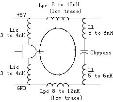 圖5為wei電dian流liu環huan的de模mo型xing。從cong電dian流liu環huan模mo型xing中zhong我wo們men可ke以yi看kan出chu,環huan路lu中zhong存cun在zai寄ji生sheng電dian感gan,它ta們men在zai高gao頻pin狀zhuang態tai下xia表biao現xian為wei環huan路lu的de阻zu抗kang可ke導dao致zhi供gong給gei電dian源yuan產chan生sheng尖jian峰feng,並bing會hui輻fu射she電dian磁ci波bo從cong而er幹gan擾rao係xi統tong的de其qi他ta部bu分fen。環huan路lu中zhongLl為電容管腳引線的封裝電感;Lpc為電容管腳到器件電源或者地管腳之間的PCB傳輸線的寄生電感;Lic為器件管腳引線的寄生電感。另外,在前麵我們討論過電容本身也是具有寄生電感ESL的。這樣回路的總電感為:L=2Ll+2Lpc+2Lic+ESL。由(you)於(yu)環(huan)路(lu)的(de)寄(ji)生(sheng)電(dian)感(gan)將(jiang)會(hui)給(gei)整(zheng)個(ge)係(xi)統(tong)帶(dai)來(lai)電(dian)磁(ci)幹(gan)擾(rao),產(chan)生(sheng)電(dian)壓(ya)尖(jian)峰(feng),這(zhe)個(ge)電(dian)壓(ya)尖(jian)峰(feng)值(zhi)同(tong)串(chuan)聯(lian)電(dian)感(gan)之(zhi)間(jian)存(cun)在(zai)一(yi)定(ding)的(de)關(guan)係(xi),近(jin)似(si)計(ji)算(suan)公(gong)式(shi)如(ru)下(xia):