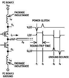 圖6為一個簡單的圖騰柱I/O口電路,驅動一個串聯源端匹配的傳輸線。圖中LV和LG為器件電源管腳和地管腳的封裝電感,A、Bweilianggechangxiaoyingguan,zuoweikaiguanshiyong。jiashechushishikechuanshuxianshanggediandedianyahedianliujunweiling,zaimouyishikeqijianjiangqudongchuanshuxianweigaodianping,zheshihouqijianjiuxuyaocongdianyuanguanjiaoxishoudianliu。zaishijiant1,合上開關A,電流從PCB板上的VCC流入,流經封裝電感LV,跨越開關A,串聯終端電阻,然後流入傳輸線,輸出電流幅度為(1/2)VCC/Z0。電流在傳輸線網絡上持續一個完整的輪回(round-trip)時間,在時間t2結束。至此以後,整個傳輸線處於電荷充滿狀態,不需要額外流入電流來維持。當電流瞬間湧過封裝電感LV時,將在結點V1處導致芯片電壓的擾動。在時間t3,關閉開關A,這一動作不會導致脈衝噪聲的產生,因為在開關A打開的瞬間是沒有電流流過的。同時,合上開關B,這時傳輸線、地平麵、封裝電感LG以及開關B形成一環路,有瞬間電流流過開關B,這樣在結點G1處產生地彈擾動。如果在V1和G1之間加上一旁路電容(放置在芯片內部)的話,可以使得V1點處和G1點處的瞬態電壓擾動相同,這樣在每一次開關切換時,V1點和G1點均會產生電壓擾動,然而幅度將會減半。