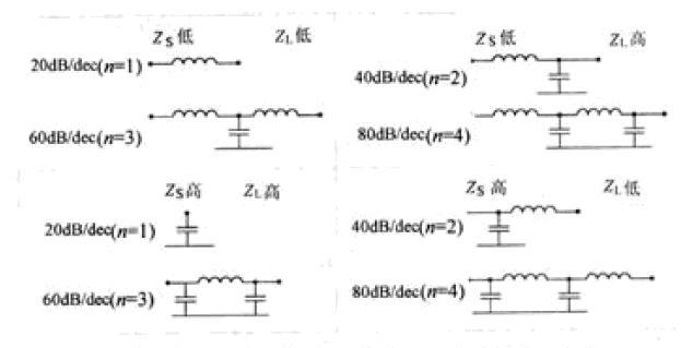 EMC設計中的濾波器通常指由L,C構成的低通濾波器。濾波器結構的選擇是由"最大不匹配原則"決定的。即在任何濾波器中,電容兩端存在高阻抗,電感兩端存在低阻抗。圖1是利用最大不匹配原則得到的濾波器的結構與ZS和ZL的配合關係,每種情形給出了2種結構及相應的衰減斜率(n表示濾波器中電容元件和電感元件的總數)。
