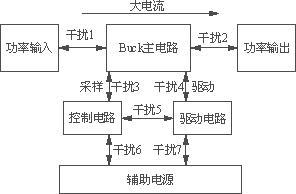 利用上述關係式,減小通路麵積是減小輻射幹擾的關鍵。在此Buck電路中,應該使輸入端電容、開關管、功率二極管彼此緊靠,且布線緊湊;同時使輸出端功率二極管、電感、輸出電容、采樣電阻彼此緊靠。