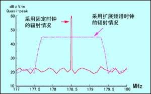 所謂的“擴展頻譜時鍾”是(shi)一(yi)項(xiang)能(neng)夠(gou)減(jian)小(xiao)輻(fu)射(she)測(ce)量(liang)值(zhi)的(de)新(xin)技(ji)術(shu),但(dan)這(zhe)並(bing)非(fei)真(zhen)正(zheng)減(jian)小(xiao)了(le)瞬(shun)時(shi)發(fa)射(she)功(gong)率(lv),因(yin)此(ci),對(dui)一(yi)些(xie)快(kuai)速(su)反(fan)應(ying)設(she)備(bei)仍(reng)可(ke)能(neng)產(chan)生(sheng)同(tong)樣(yang)的(de)幹(gan)擾(rao)。這(zhe)種(zhong)技(ji)術(shu)對(dui)時(shi)鍾(zhong)頻(pin)率(lv)進(jin)行(xing)1% ~ 2% 的調製,從而擴散諧波分量,這樣在CISPR16或FCC發射測試中的峰值較低。所測的發射減小量取決於帶寬和測試接收機的積分時間常數,因此這有一點投機之嫌,但該項技術已被FCC所接受,並在美國和歐洲廣泛應用。調製度要控製在音頻範圍內,這樣才不會使時鍾信號失真,圖2是一時鍾諧波發射改善的例子。擴展頻譜時鍾不能應用於要求嚴格的時間通信網絡中,比如以太網、光纖、FDD、ATM、SONET和ADSL。