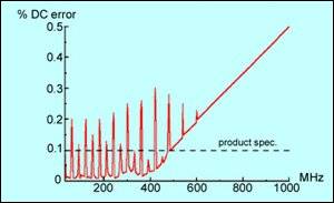 大多數模擬設備的抗擾度問題是由射頻解調引起的。運放每個管腳都對射頻幹擾十分敏感,這與所使用的反饋線路無關(見圖3),所有半導體對射頻都有解調作用,但在模擬電路上的問題更嚴重。即使低速運放也能解調移動電話頻率及其以上頻率的信號,圖4表明了實際產品的測試結果。
