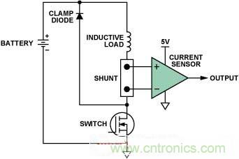 圖1所示為汽車應用環境中用於監控電磁閥或其它感性負載的常見配置。