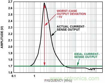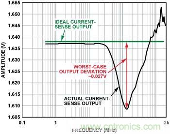 圖2所示為輸入在較寬頻率範圍內變化時電流傳感器的直流輸出與其理想值的偏差情況。從圖中可以看出,在1 MHz至20 MHz的頻率範圍內,偏差最為顯著(>0.1 V),且3 MHz時直流誤差達到最大值(1 V),這在放大器0 V至5 V的輸出電壓範圍中占據很大比例。