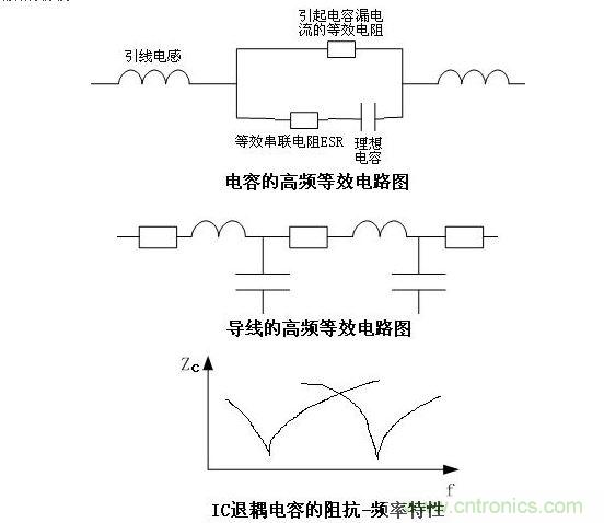 電(dian)容(rong),在(zai)中(zhong)低(di)頻(pin)或(huo)直(zhi)流(liu)情(qing)況(kuang)下(xia),就(jiu)是(shi)一(yi)個(ge)儲(chu)能(neng)組(zu)件(jian),隻(zhi)表(biao)現(xian)為(wei)一(yi)個(ge)電(dian)容(rong)的(de)特(te)性(xing),但(dan)在(zai)高(gao)頻(pin)情(qing)況(kuang)下(xia),它(ta)就(jiu)不(bu)僅(jin)僅(jin)是(shi)個(ge)電(dian)容(rong)了(le),它(ta)有(you)一(yi)個(ge)理(li)想(xiang)電(dian)容(rong)的(de)特(te)性(xing),有(you)漏(lou)電(dian)流(liu)(在高頻等效電路上表現為R),有引線電感,還在導致電壓脈衝波動情況下發熱的ESR(等效串聯電阻),(如圖)。從這個圖上分析,能幫我們設計師得出很多有益的設計思路。第一,按照常規思路,1/2πfcshidianrongderongkang,yinggaishipinlvyuegao,rongkangyuexiao,lvboxiaoguoyuehao,jiyuegaopindezaboyuerongyibeixiefangdiao,danshishibingfeiruci,yinweiyinxiandiangandecunzai,yizhidianrongjinjinzaiqi1/2πfc=2πf L等式成立的時候,才是整體阻抗最小的時候,濾波效果才最好,頻率高了低了都會濾波效果下降,由此就可以分析出結論,為什麼在IC的VCC端都會加兩支電容,一支電解的,一支瓷片的,並且容值一般相差100倍以上多一點。就是兩支不同的電容的諧振頻率點岔開了一段距離,既利於對稍高頻的濾波,也利於對較低頻的濾波。