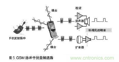 當手機與基站通訊,或兩個手機彼此接近時,發射脈衝通過擴音器,揚聲器,或頭戴式耳機線傳入音頻通路。見圖5,結果是音頻質量大幅降低。