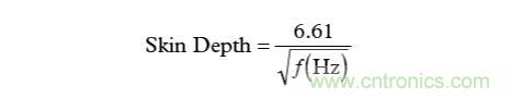 在高頻段,必須考慮一種稱為“趨膚效應”的現象。趨膚效應會引起電流流向導線的外表麵--結果會使得導線的橫截麵變窄,因此使直流(DC)電阻增大。雖然趨膚效應超出了本文討論的範圍,這裏還是給出銅線中趨膚深度(SkinDepth)的一個很好的近似公式(以cm為單位):