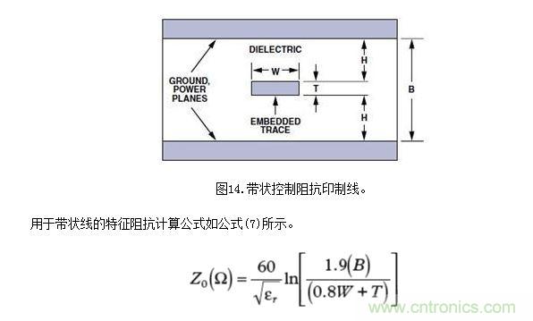 帶狀控製阻抗印製線(參見圖14)采用了兩層接地平麵,信號印製線夾在其中。這種方法使用了較多的印製線,需要的PCB層數更多,對電介質厚度變化敏感,而且成本更高--所以通常隻用於要求嚴格的應用中。