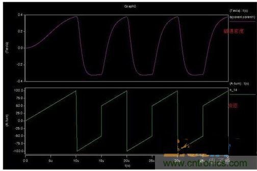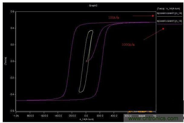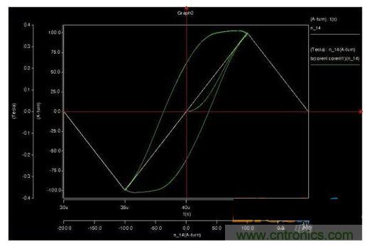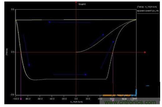 2、仿真CCM模式,磁滯回線上會出現兩個安匝跳變位置,但是磁通密度並不能跳變,而是通過下降來釋放能量。