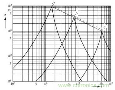 由圖中可以看出,電感線圈的阻抗開始的時候是隨著頻率升高而增大的,但當它的阻抗增大到最大值以後,阻抗反而隨著 頻pin率lv升sheng高gao而er迅xun速su下xia降jiang,這zhe是shi因yin為wei並bing聯lian分fen布bu電dian容rong的de作zuo用yong。當dang阻zu抗kang增zeng到dao最zui大da值zhi的de地di方fang,就jiu是shi電dian感gan線xian圈quan的de分fen布bu電dian容rong與yu等deng效xiao電dian感gan產chan生sheng並bing聯lian諧xie振zhen的de地di方fang。圖tu中zhong,L1 > L2 > L3,由此可知電感線圈的電感量越大,其諧振頻率就越低。從圖2中可以看出,如果要對頻率為1MHZ的幹擾信號進行抑製,選用L1倒不如選用L3,因為 L3的電感量要比L1小十幾倍,因此L3的成本也要比L1低很多。