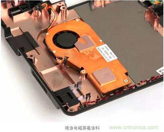 (2)在整個電子設備外殼就具有高電磁波發射能力的電路和器件周圍,添加電磁波屏蔽罩、粘貼金屬箔、噴塗導電塗料、鍍一層導電金屬層、增加電磁波吸收材料。