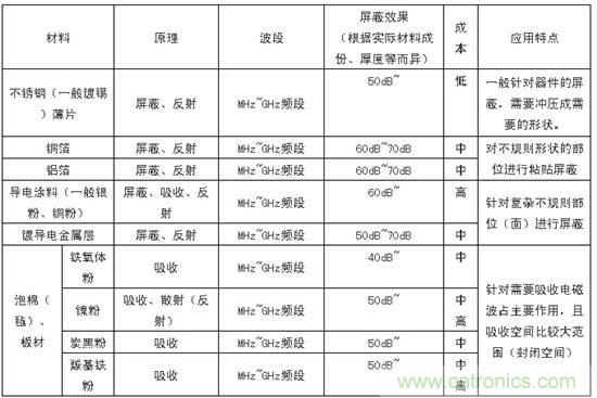 不鏽鋼、銅箔、鋁箔、導電塗料、電磁波吸收材料(鐵氧體、鎳粉、碳黑、羰基鐵等)。