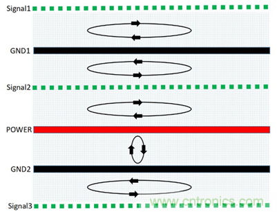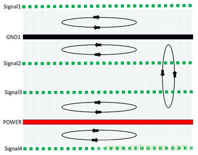 (1)由於信號層與回流參考平麵相鄰,S1、S2、S3相鄰地平麵,有最佳的磁通抵消效果,優選布線層S2,其次S3、S1。