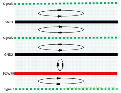 (3)從屏蔽的角度,地平麵一般均作了接地的處理,並作為基準電平參考點,其屏蔽效果遠遠優於電源平麵;