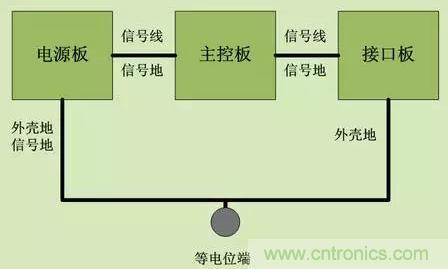 靜jing電dian要yao得de到dao有you效xiao釋shi放fang,就jiu要yao保bao證zheng良liang好hao的de接jie地di。對dui於yu醫yi療liao電dian子zi,一yi般ban的de醫yi療liao電dian子zi產chan品pin比bi如ru監jian護hu儀yi,機ji身shen後hou麵mian都dou會hui有you一yi個ge等deng電dian位wei接jie地di端duan。在zai做zuoESD試驗的時候,這個接地 端也是要接大地的,這樣就有了一個靜電快速泄放的途徑。如圖5.1,假如主電路板分為三個模塊:電源板,主控板和接口板,接口板的接口外殼地要和信號地分 kai,ranhoujiekoubandewaikedihedengdianweiduanyongcudaoxianxianglian。xitongdexinhaodikeyicongdianyuanbandewaikediyuxinhaodixianglianranhougongyongyigencudaoxianyudengdianweiduanxianglian。zhisuoyimeiyoucaiyongmeikuaiban 都分別接到等電位端的星形接地方法,是因為星形接地會形成接地環路,從而增加射頻噪聲和容易受電磁幹擾。