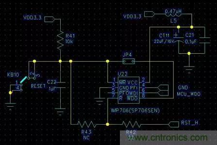 本人有一次對整機EMC整改,ESD試驗時,按鍵控製板的MCU老是複位。後來用示波器進行追蹤,發現是外部看門狗芯片發生複位,導致MCU複位。於是先在電源上並接TVS管,還是會複位;再在看門狗芯片VCC管腳旁並接22uF鉭電容,情況好一些,但還是會複位;最後再串接一個0.47uH的貼片電容,組成LC濾波(如圖3.1所示)。在+-6KV的ESD接觸放電下,就再也不會複位,而且工作正常。