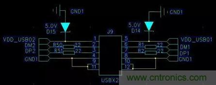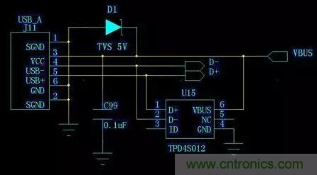 對外接口的信號線同樣需要保護,否則靜電經過信號線直接到達芯片IO管腳,雖然芯片的IO都有二極管保護,一般可以抵禦+-2KV的靜電,但是對於+-6KV的ESD接觸放電,就會遭遇損壞的風險。同樣是USB接口,如圖2.1,差分信號線D+和D-接了個ESD器件TPD4S012,實際上是與USB電源和地並接反向二極管,把電流導向USB電源或者地。