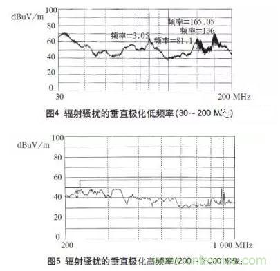 本開關電源一次通過了傳導騷擾的測試,測試波形如圖2、3所示。輻射騷擾高頻段230~1000MHz也測試合格,如圖5所示。隻是在30~200MHz頻段範圍內的垂直極化指標超標,最大超標20dB,如圖4所示。