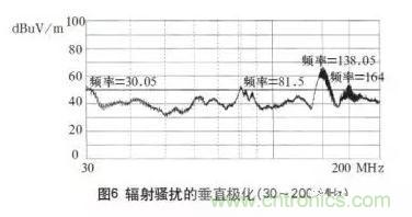 根據上麵對高頻開關電源騷擾源和鐵氧體元件的分析,決定在靠近騷擾源的地方套磁珠與磁環。圖1a中電容C1的接地端套鐵氧體磁珠(φ3.5×φ1.3×3.5),圖1b中整流二極管D1和D2使用肖特基二極管,其陽極套鐵氧體磁珠(φ3.5×φ1.3×3.5),直流輸出線纜用鐵氧體磁環(φ13.5×φ7.5×7)繞兩圈且靠近出口處。經過處理後重新測試,其掃描曲線如圖6所示。由此可見,大部分頻段的輻射騷擾已被抑製到標準要求以下,但在頻率81、138、165kHz附近處仍然超標。