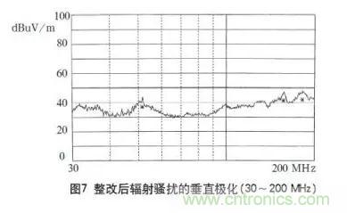 根據對開關電源電磁騷擾源的分析可知,在圖1b電路中高頻變壓器T1也(ye)是(shi)一(yi)個(ge)騷(sao)擾(rao)源(yuan)。為(wei)了(le)阻(zu)止(zhi)高(gao)頻(pin)變(bian)壓(ya)器(qi)產(chan)生(sheng)的(de)騷(sao)擾(rao)信(xin)號(hao)以(yi)輻(fu)射(she)方(fang)式(shi)發(fa)射(she),把(ba)變(bian)壓(ya)器(qi)的(de)外(wai)殼(ke)用(yong)屏(ping)蔽(bi)材(cai)料(liao)銅(tong)箔(bo)環(huan)繞(rao)一(yi)圈(quan)構(gou)成(cheng)一(yi)回(hui)路(lu)加(jia)以(yi)屏(ping)蔽(bi),以(yi)切(qie)斷(duan)變(bian)壓(ya)器(qi)通(tong)過(guo)空(kong)間(jian)耦(ou)合(he)形(xing)成(cheng)的(de)輻(fu)射(she)騷(sao)擾(rao)傳(chuan)播(bo)途(tu)徑(jing)。並(bing)且(qie)為(wei)了(le)減(jian)少(shao)因(yin)變(bian)壓(ya)器(qi)一(yi)次(ci)側(ce)開(kai)通(tong)時(shi)電(dian)流(liu)瞬(shun)間(jian)突(tu)變(bian)產(chan)生(sheng)的(de)di/dt騷擾,在變壓器T1的一次側串進1個ge電dian感gan,以yi減jian小xiao器qi件jian的de開kai通tong損sun耗hao,降jiang低di輻fu射she騷sao擾rao信xin號hao。經jing過guo整zheng改gai後hou,輻fu射she騷sao擾rao大da大da下xia降jiang,再zai次ci對dui本ben電dian源yuan輻fu射she騷sao擾rao進jin行xing測ce試shi,完wan全quan達da到dao了le標biao準zhun要yao求qiu,其qi測ce試shi結jie果guo如ru圖tu7所示。