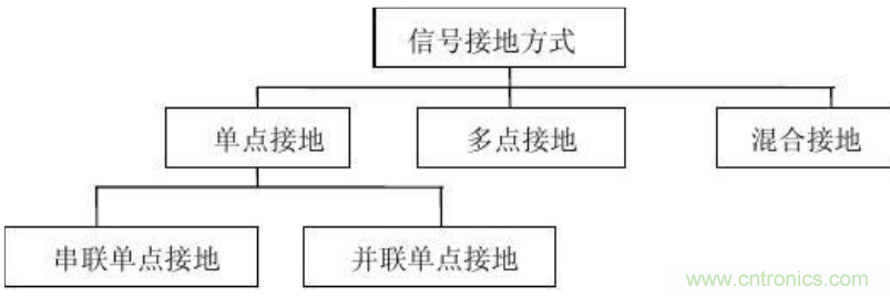 接jie地di沒mei有you一yi個ge很hen係xi統tong的de理li論lun或huo模mo型xing,人ren們men在zai考kao慮lv接jie地di時shi隻zhi能neng依yi靠kao他ta過guo去qu的de經jing驗yan或huo從cong書shu上shang看kan到dao的de經jing驗yan。接jie地di的de方fang法fa很hen多duo,具ju體ti使shi用yong那na一yi種zhong方fang法fa取qu決jue於yu係xi統tong的de結jie構gou和he功gong能neng。接jie地di的de方fang式shi可ke以yi分fen為wei三san種zhong:單點接地,多點接地和混合接地。其中單點接地可以分為串聯單點接地和並聯單點接地兩種,如圖所示。