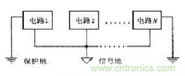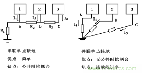 單點接地有兩種類型,一種是串聯單點接地,另一種是並聯單點接地。如圖8-3所示。