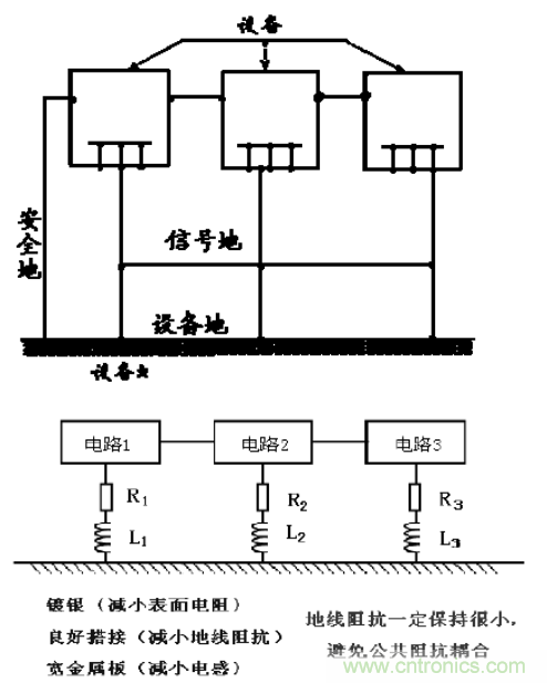 多點接地時容易產生公共阻抗耦合問題。在低頻的場合,通過單點接地可以解決這個問題。但在高頻時,隻能通過減小地線阻抗(減小公共阻抗)來解決。在導體表麵鍍銀能夠降低導體的電阻,如圖所示。